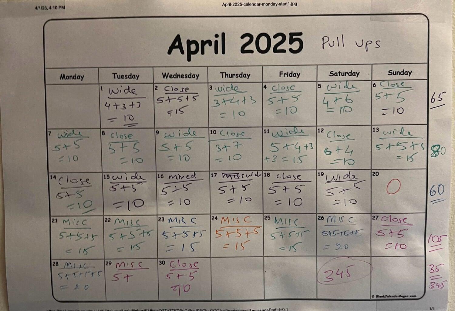 Years of not meeting my fitness goals has taught me another important lesson - it starts with setting the right goals. I’ve come a long way in how I set my goals. With 300 days to go, I could have easily picked 3000 pull-ups as my goal, but I held back. With kids, parents, family, friends, travel, changing weather, and more—who knows what life has in store for me. There is a good chance that I might miss a few days, and that's okay. Maybe I’ve let down the Gods of Big Hairy Audacious Goals (BHAGs), but come January 1, 2026, I’ll have done 2,500 more pull-ups than the Suraj of January 1, 2025.