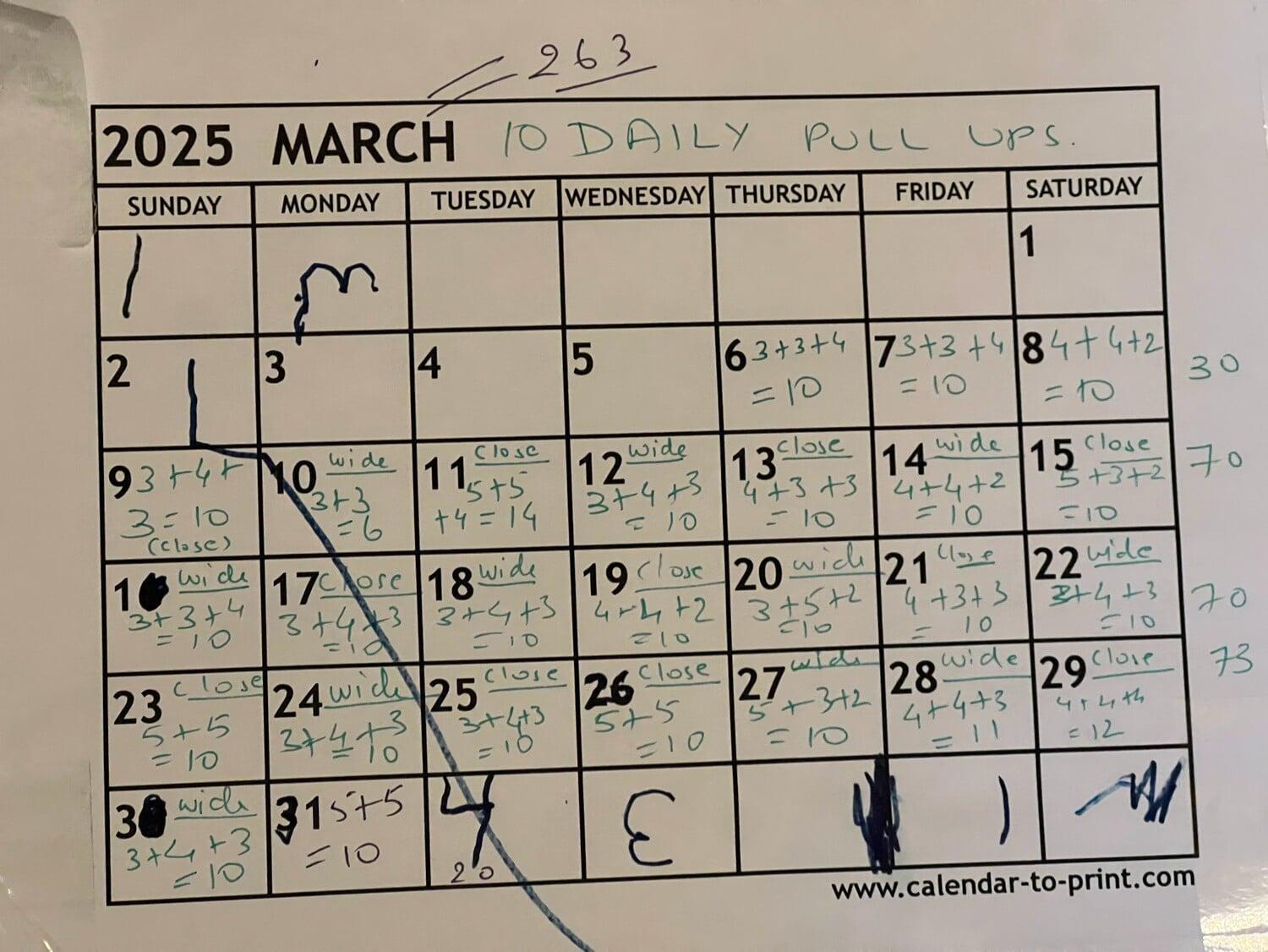 Not in one go—but before the year ends. I set this goal on March 6, 2025, giving me exactly 300 days to complete it. That averages out to ~8.5 pull-ups per day or 10 pull-ups on 250 days. As of today (May 4, 2025) I have already completed 668 pull-ups.
